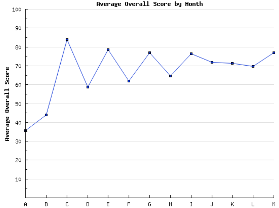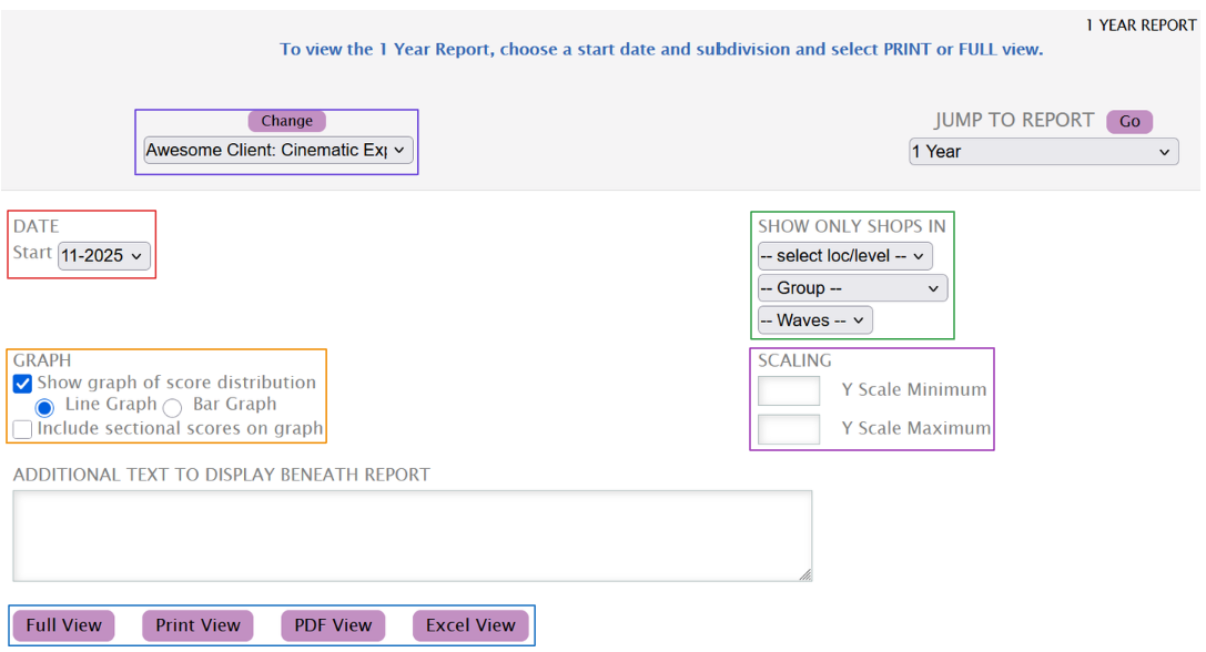 The 1 Year Report shows the trending data over a year for Overall and Sectional Scores.