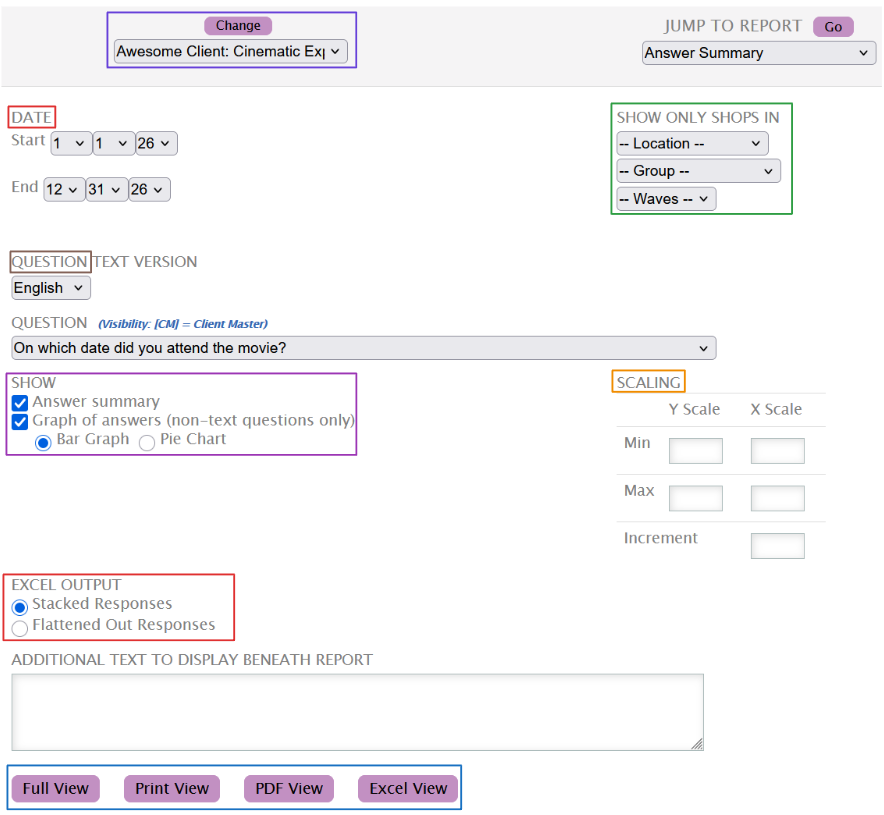 The Answer Summary report shows the breakdown of answers for selected questions within the selected date range.