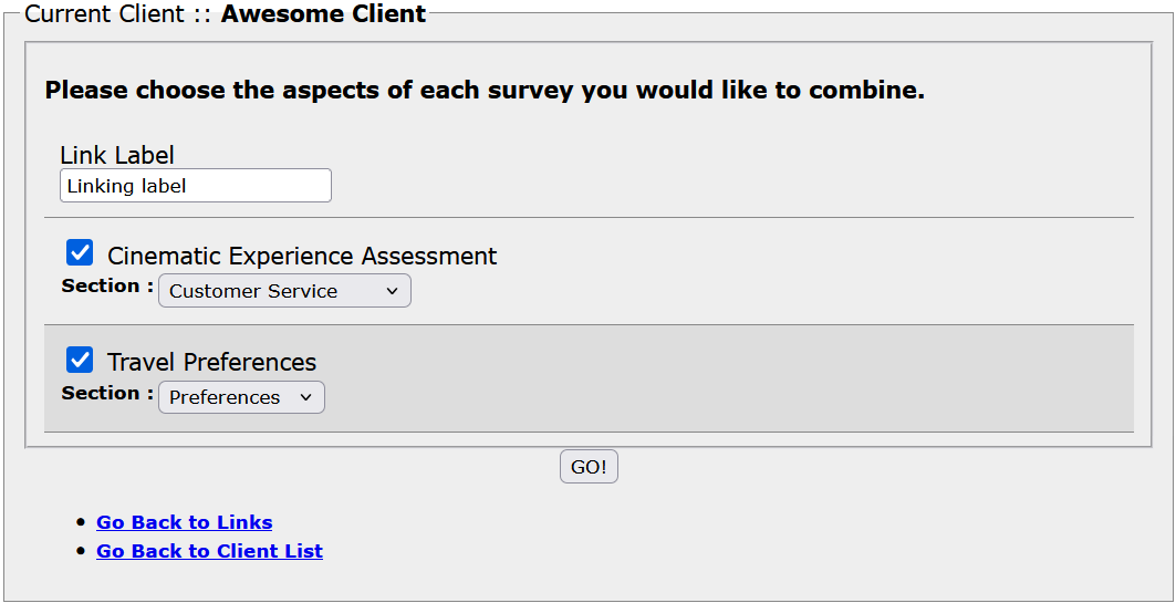 Use the Add New Link option to select the sections of surveys you want to link.