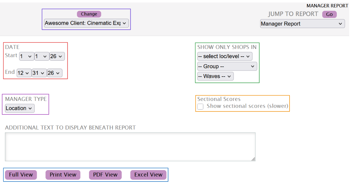 The Manager report displays the average overall and sectional scores broken down by a selected manager type.