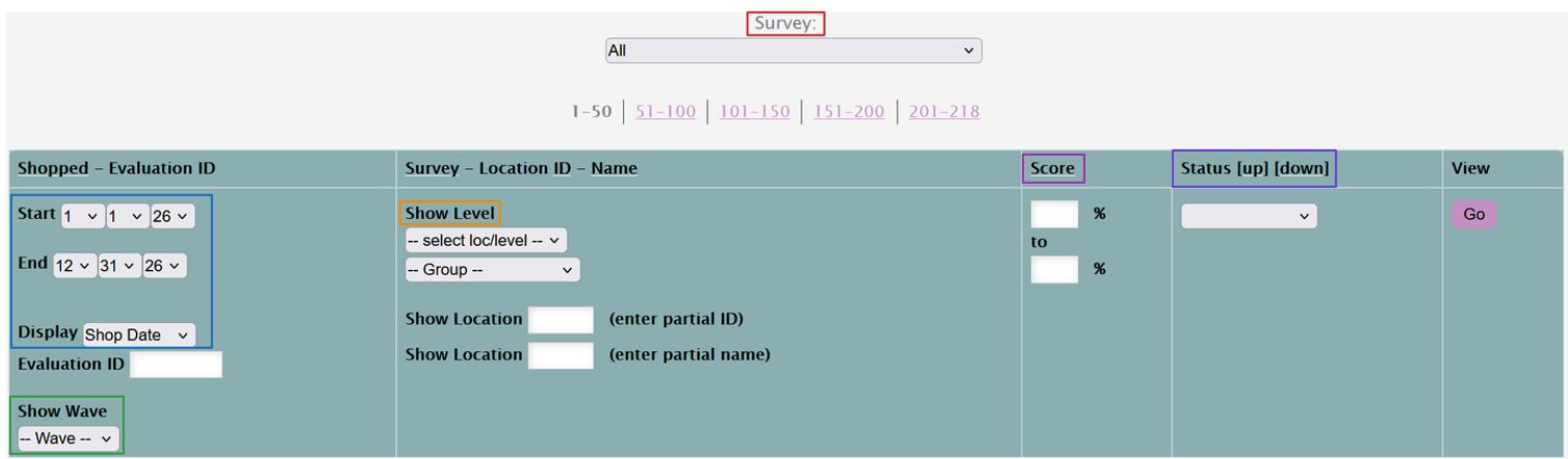 Above the filters, you can select a specific survey to filter on, or simply leave the dropdown at all to see all the shops in the preferred date range. The Display dropdown ensures you can filter by shop date, report date, or the shop's due date.